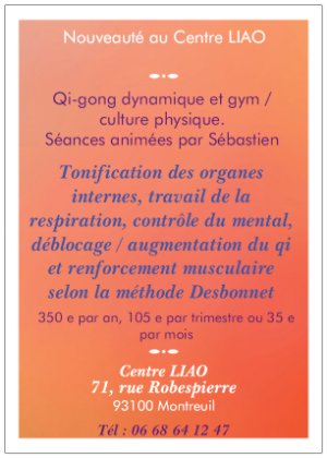 -Cours de qi-gong thérapeutique et de santé (la bannière de Ma Wang Dui et les 8 pièces de brocart = mouvements de base, le Yi Jin Jing pour les muscles et tendons / la circulation sanguine / les os…) + qi-gong martial ou dynamique pour débloquer le qi…